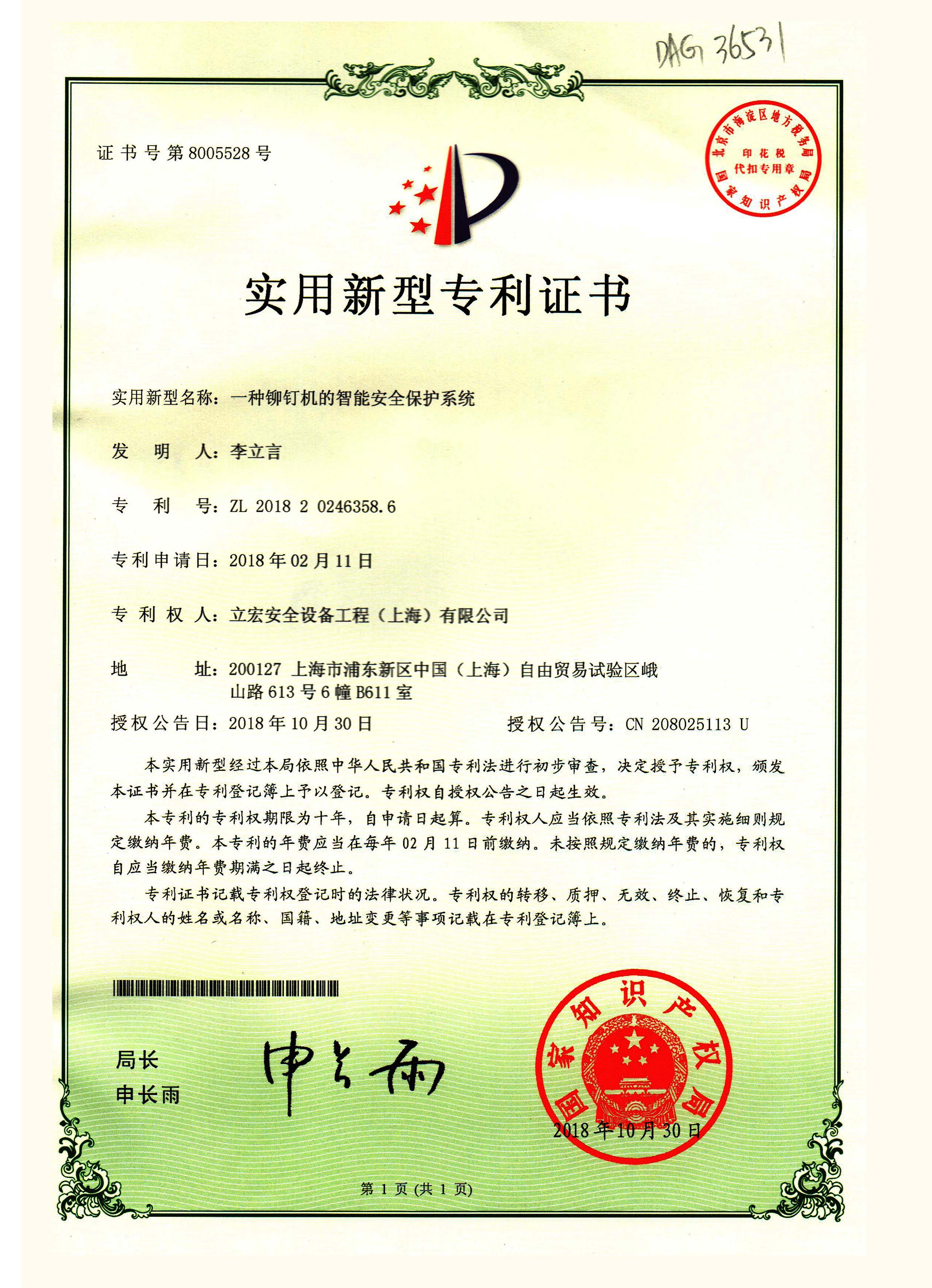實(shí)用新型名稱(chēng):一種鉚釘機(jī)的智能安全保護(hù)系統(tǒng)專(zhuān)利號(hào):ZL201820246358.6